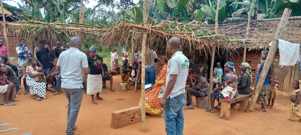 Intervention du médiateur social Baka de PALLISCO, lors de la séance de sensibilisation à Djebe Baka dans la Commune de Lomié (Crédit photo : ARESA, juin 2024)