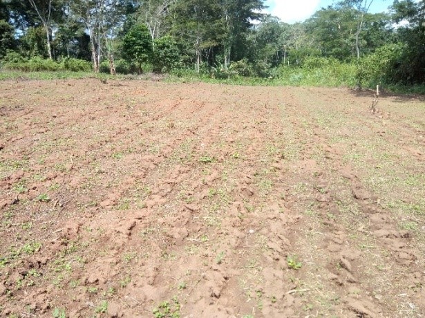 Piquets disposés en arrière-plan et lignes de semis suivant leur alignement à Menzoh dans la Commune de Mindourou